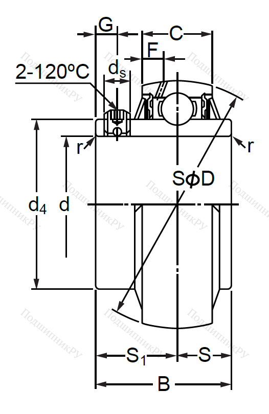 Шариковое радиальное тело, имеющее сферической формы внешнюю шину и комплектующееся специальными пыльниками для защиты. Конструкция неразъемная с шириной или высотой подшипника B(H): 77.8мм, с уплотнениями и расширенной внутренней обоймой, которая может быть зафиксирована при помощи двух винтов или самозапирающего механизма.